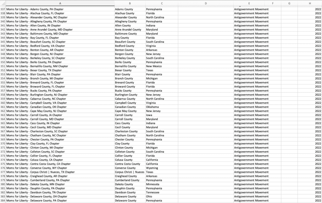 Moms for Liberty, for instance, appears on the list no fewer than 220 times, once for each chapter the SPLC recorded. Eagle Forum, a conservative group founded by Phyllis Schlafly to oppose the Equal Rights Amendment, appears 16 times, to account for multiple chapters.