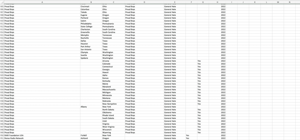 Twenty-five entries for Proud Boys list each group as “statewide,” and all 48 chapters of Patriot Front appear on the list as “statewide.”