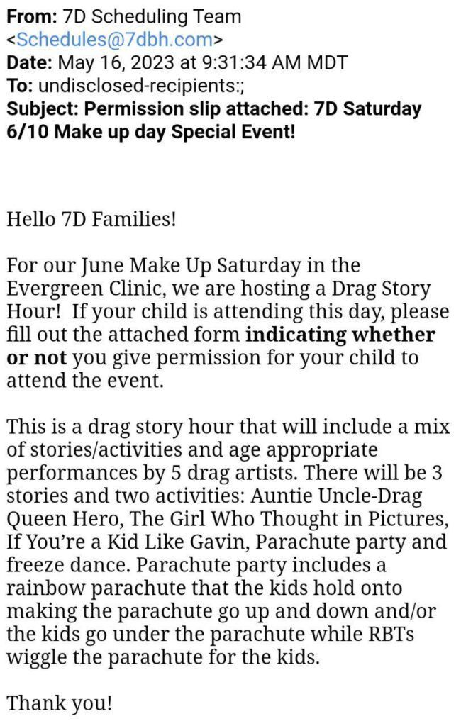 Seven Dimensions Behavioral Health uses Applied Behavior Analysis, a therapy used primarily with those who have Autism Spectrum Disorder (ASD), to work with patients of “all ages and diagnoses serving the Colorado front range.” The organization sent a May 16 email to parents advertising a Drag Story Hour for their children and promising that it would include a “mix of stories/activities and age appropriate performances by 5 drag artists.”