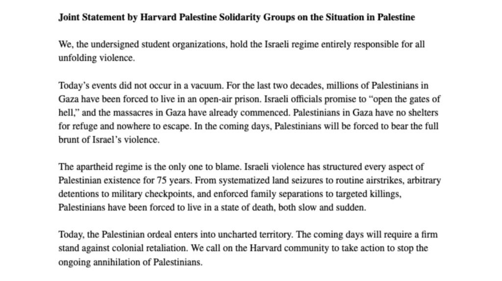 Adams discovered that four Harvard Law School student organizations were signatories to the letter that other university organizations had signed onto. They were the Harvard Middle Eastern and North African Law Student Association, Harvard Law School Justice for Palestine, Harvard South Asian Law Students Association, and the Harvard Muslim Law School Association. Their signatures and support were public.