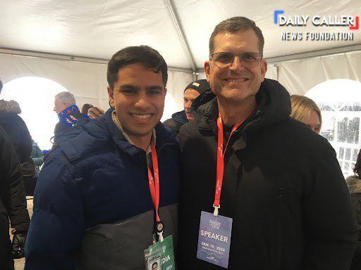 Jim Harbaugh, the head football coach at the University of Michigan, stands alongside Arjun Singh of the Daily Caller News Foundation at the March for Life rally in Washington, D.C. on Friday, January 19, 2024. (Photo via Arjun Singh / Daily Caller News Foundation)