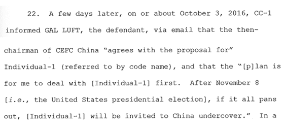 One troubling example in which it appears CEFC’s overtures succeeded is outlined in a Justice Department indictment of Gal Luft, co-director of the Institute for the Analysis of Global Security (IAGS)—a think tank founded by Woolsey. The indictment, unsealed in July 2023, charges Luft with violating the Foreign Agent Registration Act by, among other things, working with Ho and Ye to recruit and pay Woolsey (identified as “individual-1” in the Luft indictment) to “publicly support certain policies with respect to China.” It says:
