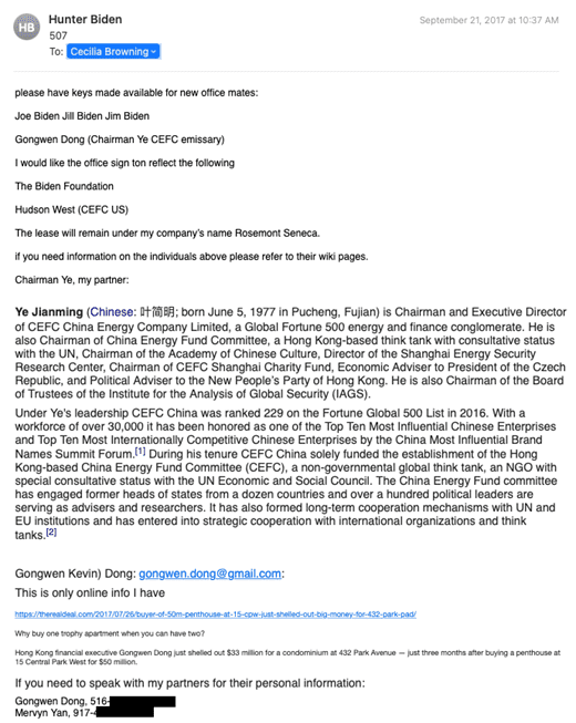 Emails show that the D.C. office was to be occupied by Joe Biden, his wife Jill, brother Jim, and son Hunter, along with the younger Biden’s business partner Dong, whom he characterized as an “emissary” of Ye, CEFC’s chairman.