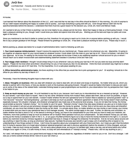 One document, an email sent the month after Ye’s detention in China, was written as CEFC China Energy began to dissolve. In the email, Hunter Biden’s secretary at Hudson West III, JiaQi Bao, encourages the younger Biden to think of the financial agreement between himself and Ye as a personal agreement.