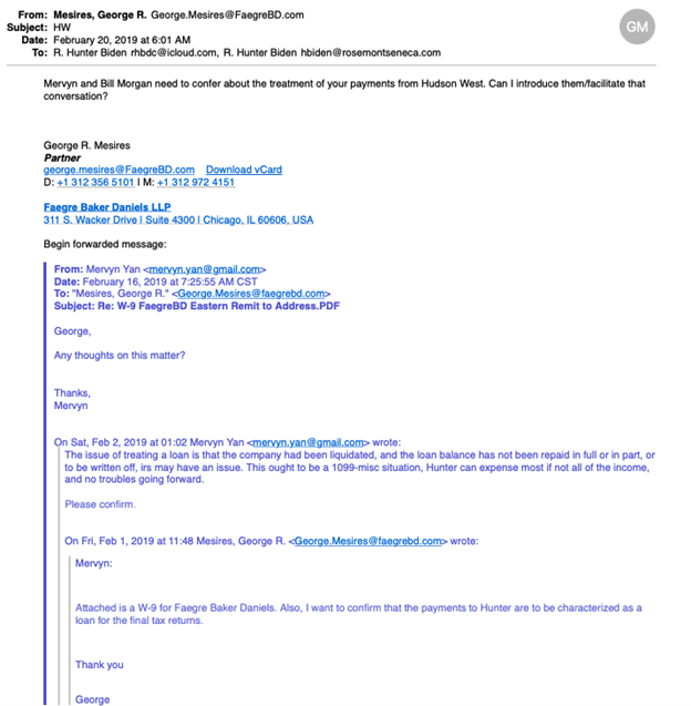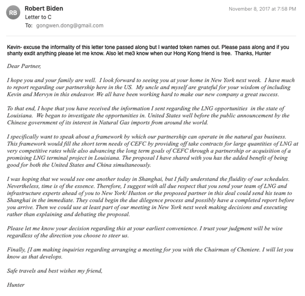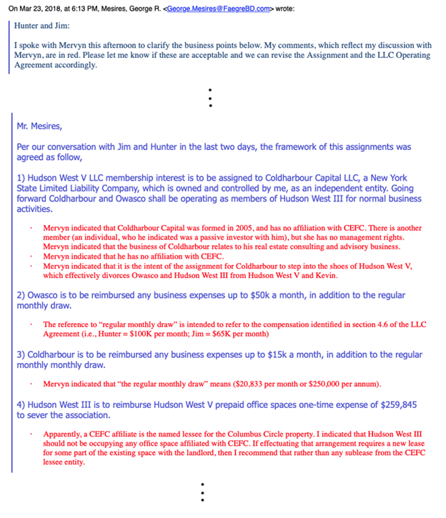 In this communication, Mesires explains to Hunter Biden and his uncle, Jim Biden, that neither Yan nor his company, Cold Harbor Capital LLC (which would replace Hudson West V in the joint venture with the younger Biden) were affiliated with CEFC China Energy.