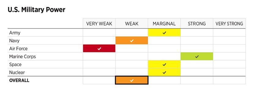 On a scale of five from “Very Weak” to “Very Strong,” America’s military ranks second from the lowest possible ranking at “Weak.”