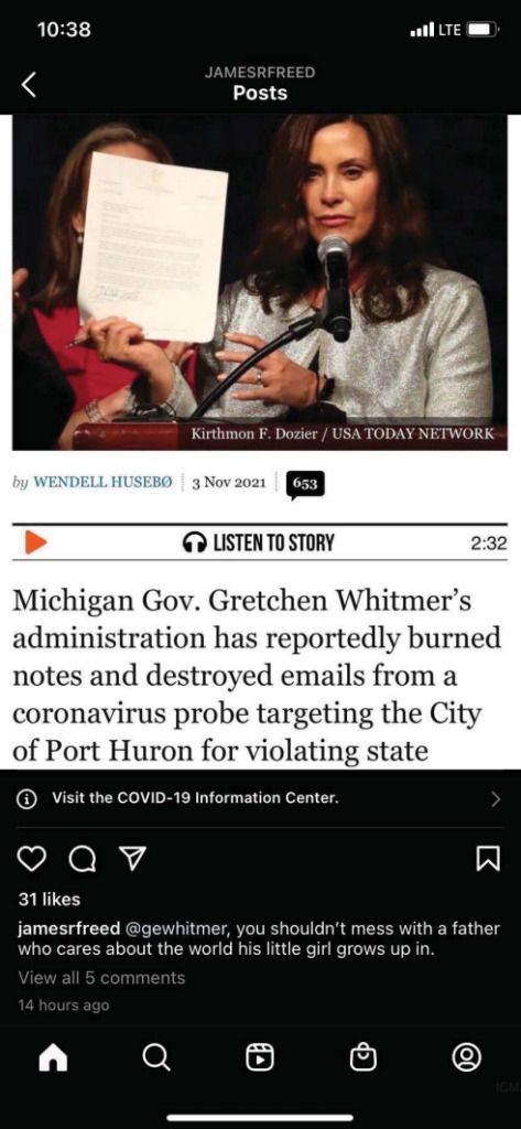 On the same day MIOSHA dropped the fine, Freed posted a Breitbart story on Instagram, tagging Whitmer.