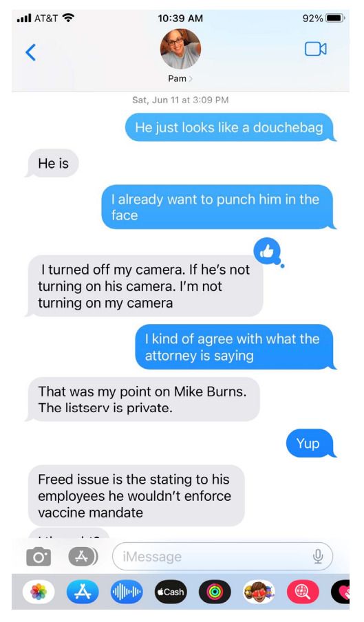During Freed’s June 11, 2022, appeal hearing, ICMA board members sent text messages condemning him as a “douchebag” and saying they wanted to “punch him in the face.”
