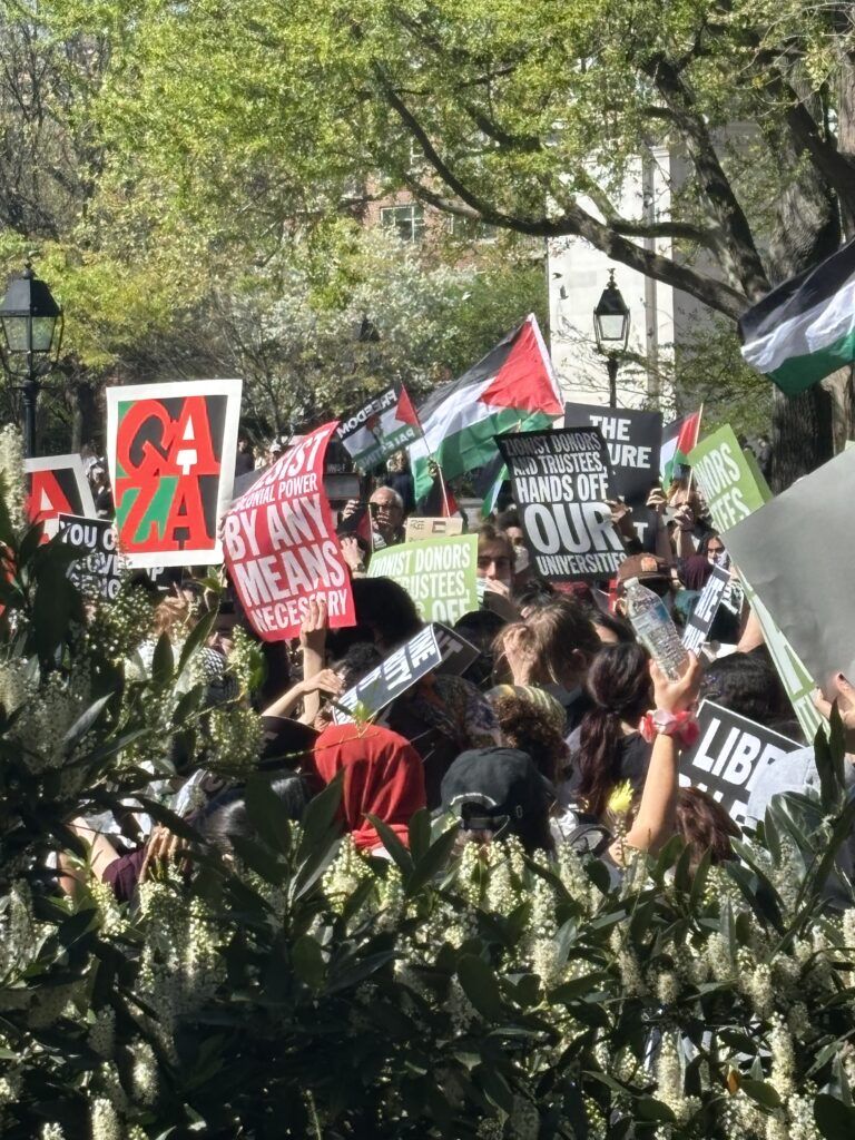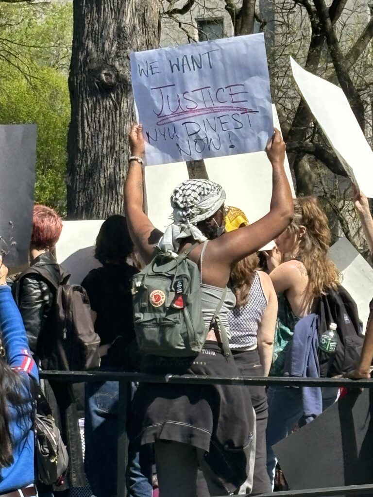 Many printed and handmade signs demanded that NYU “divest” from Israel. That’s a movement on college campuses and elsewhere that demands institutions and companies divest their financial support from anything attached to Israel.