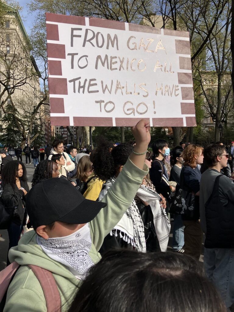One sign said that all walls, “from Gaza to Mexico,” need to be taken down.