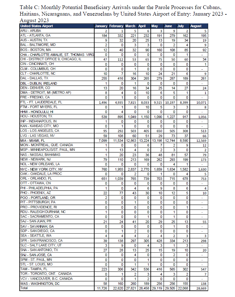 Of the top 15 airport locations used for the parole program, Florida cities stood out as a major destination of choice for those flying into a port of entry between the January-August 2023 time period.