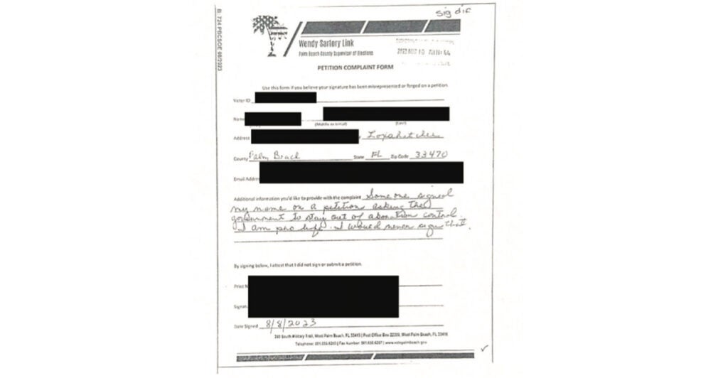 “Someone signed my named on a petition asking the government to stay of out abortion control,” one Palm Beach voter wrote. “I am pro-life. I would never sign that.”