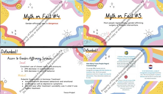 Slides from a Planned Parenthood school training titled, “Debunking Myths about Gender-Affirming Care,” obtained from the Philadelphia School District via Public Records Request.