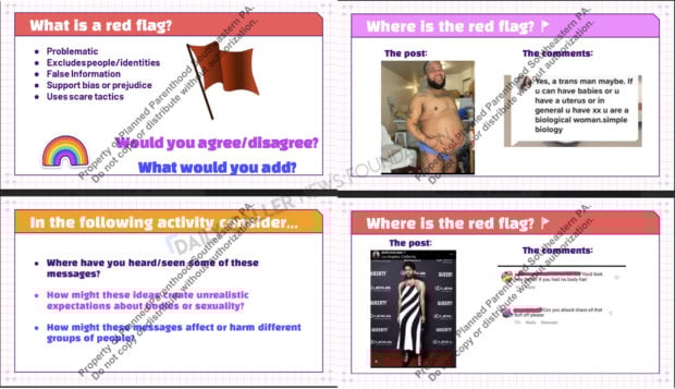 A PPSP student media literacy training asked youth to identify “red flags,” defined as content on social media that is exclusionary, prejudiced or providing false information. Students were asked to find the “red flag” when provided with a photo of a pregnant “man” and a statement that only biological women can get pregnant, documents show.