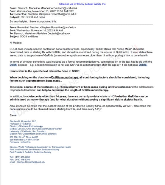 Rosenthal explained to Deutsch in a November 2022 email that giving adolescents over age 14 puberty blockers as a monotherapy, meaning without additional sex hormones, put the bone health of teen patients at serious risk, emails show.