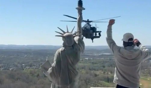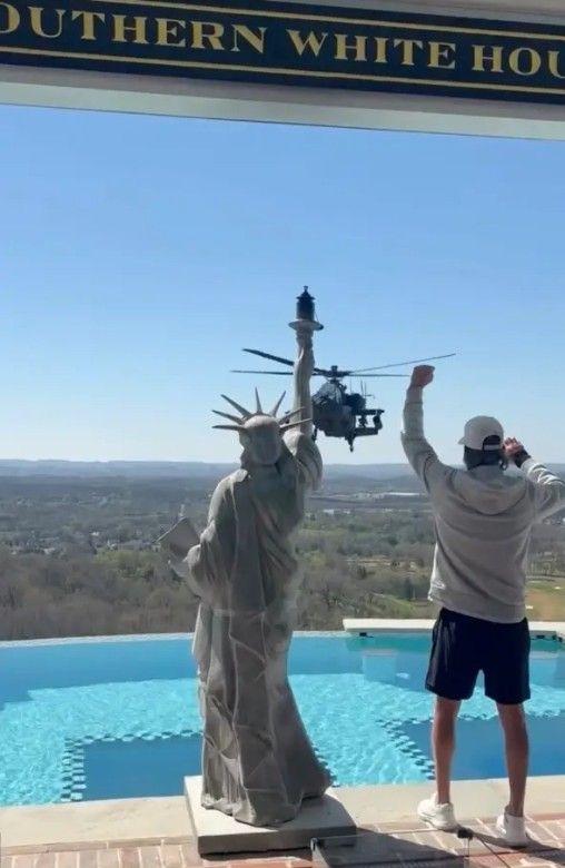 Meanwhile, Kid Rock — never one to stay quiet — leaned into the moment. The outspoken Trump ally shared the clip showing himself standing poolside beside a replica Statue of Liberty, snapping a salute as the chopper drifted low overhead before peeling away.