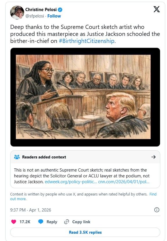 Pelosi breathlessly shared what she claimed was a courtroom sketch depicting Jackson delivering a dramatic, face-to-face legal takedown of President Donald Trump. She gushed over the image as a “masterpiece” and even thanked the sketch artist for capturing the supposed moment of judicial dominance.