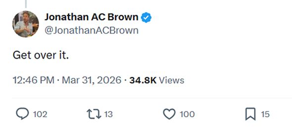 Brown responded to Lowe’s post with “get over it.” When another user said Brown’s comment was “absurdly evil,” the professor repeated the cold remark, writing “Get over it” a second time.