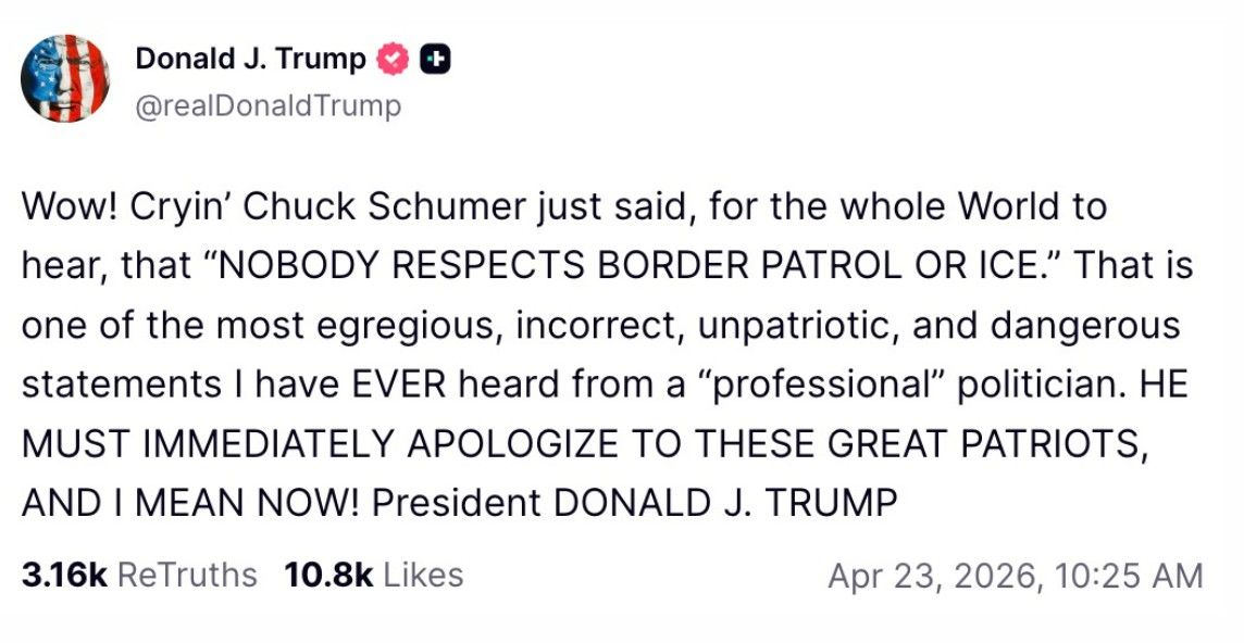 “Wow! Cryin’ Chuck Schumer just said, for the whole World to hear, that ‘NOBODY RESPECTS BORDER PATROL OR ICE,’” Trump fumed on Truth Social, resurrecting his favorite nickname for the New York Democrat. “That is one of the most egregious, incorrect, unpatriotic, and dangerous statements I have EVER heard from a ‘professional’ politician.”