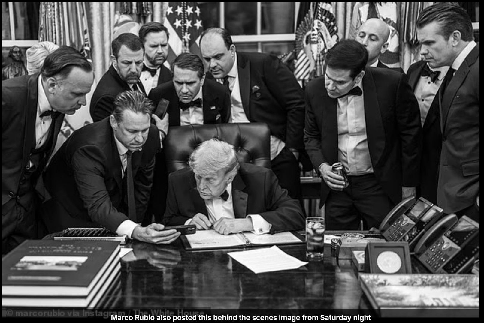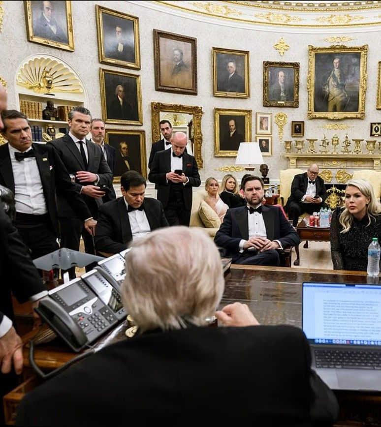 One image shows Leavitt beside President Trump, eyes fixed on a live television feed of the chaos still unfolding. Another captures a more familiar — but no less intense — scene: the Oval Office, where Trump sat at the Resolute Desk, flanked by a who’s-who of his inner circle as the administration shifted immediately into crisis mode.